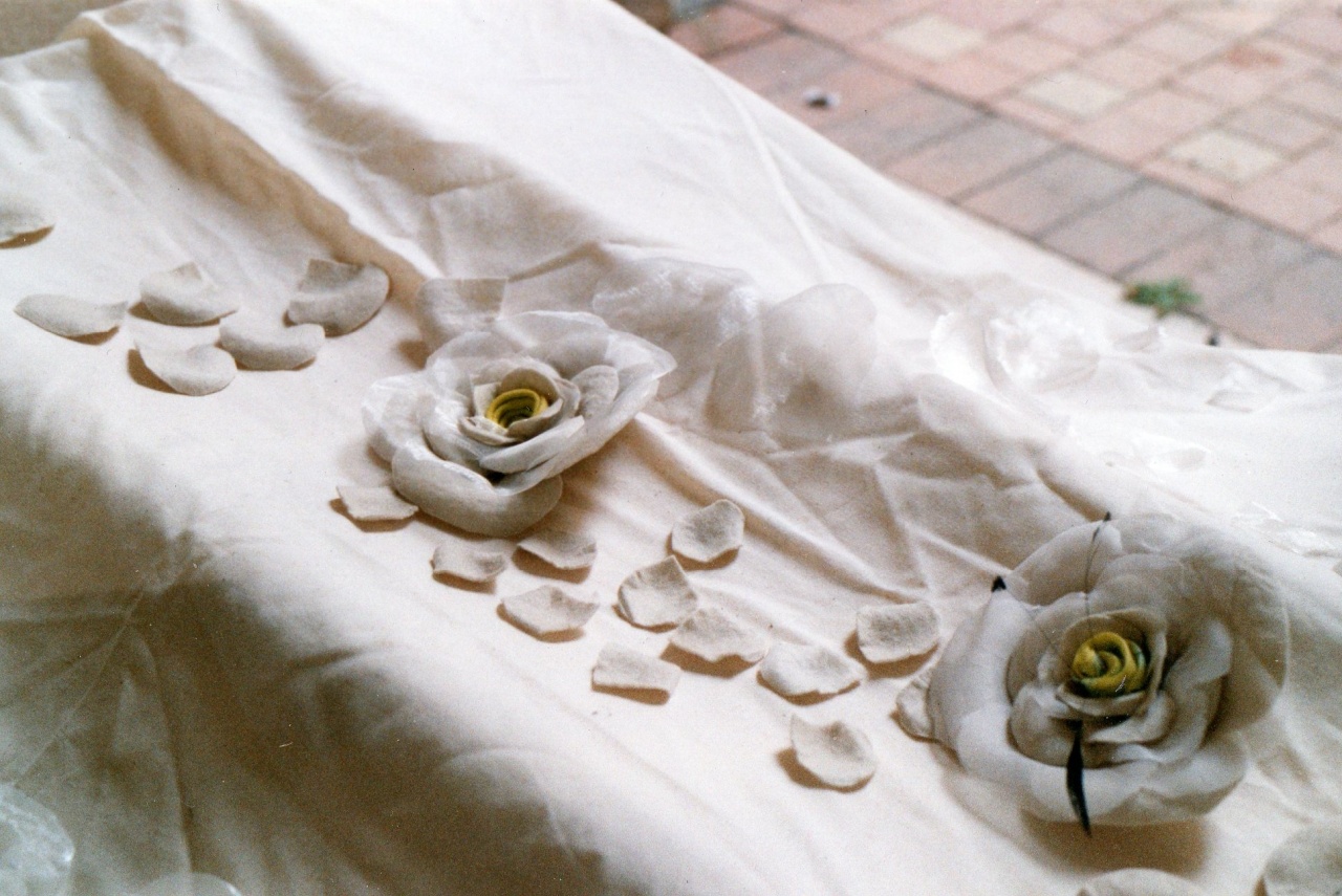 Détail de fleurs en voile de coton, feutre et plumes