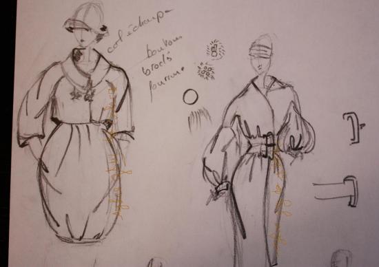 Il s'agit avant tout de trouver une ambiance, une envie, un souvenir ... Plusieurs croquis sont nécessaires et permettent de revisiter un col, une finition, le bas d'une manche...